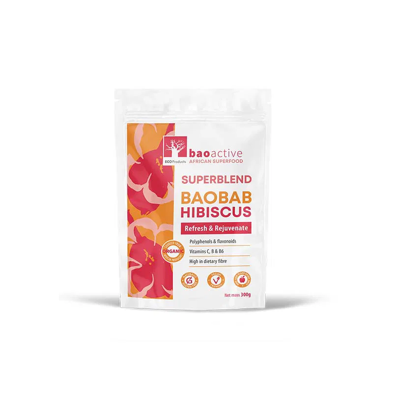 We have boosted baobab with hibiscus to create a super- nutritious blend. Baobab is rich in Vitamin C and dietary fibres which is excellent for immunity and gut health. Hibiscus is an excellent source of Vitamin B3 and B6, polyphenols and flavonoids and acts as a powerful antioxidant. For centuries both hibiscus and baobab have been used as food and in traditional medicine. This superblend brings the best of both extracts together.